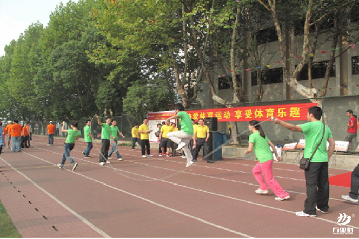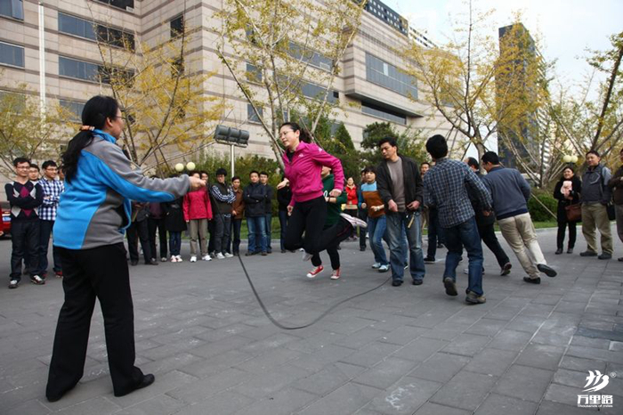 【比賽方法】比賽前,搖繩的兩個人面對面站立,持續搖繩,參賽隊員分別站在搖繩隊員的同側。裁判發令后,每隊8名運動員排隊依次連續從一搖繩人身邊跳過搖動的繩子并跑向另一搖繩人身邊,再從此人身后繞過排到隊伍末尾,使整個跑動跳躍過程形成一個“8”字形。比賽時間為2分鐘。以跳躍成功次數多少排出名次。